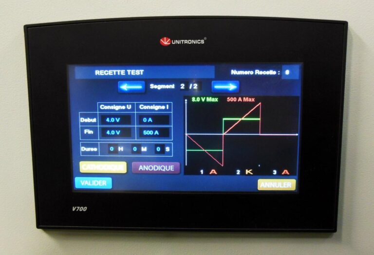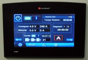 - Fonctionnement mode « Recettes » (exécution de traitements pré-enregistrés, succession de rampes et paliers en tension et/ou courant)